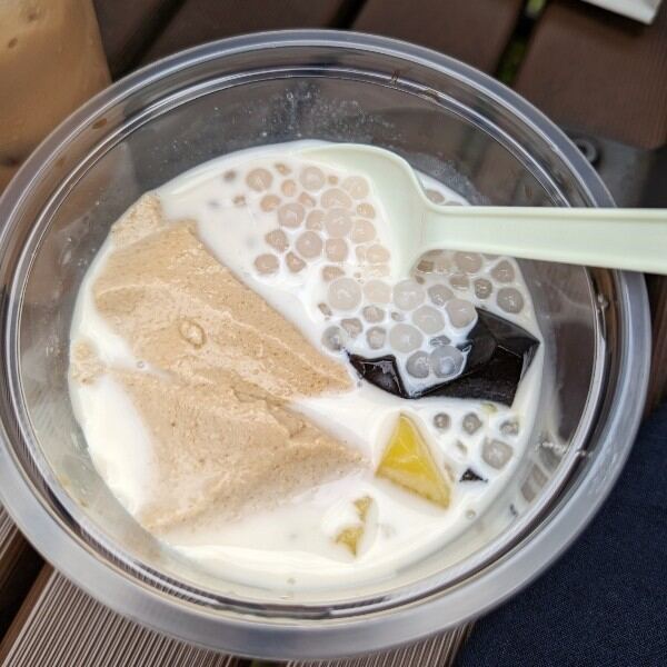 私の選んだ仙草はゼリーのようで、トッピングに選んだ黒糖プリンもマンゴーも異国っぽい味がして、結構お腹いっぱいになりました!
